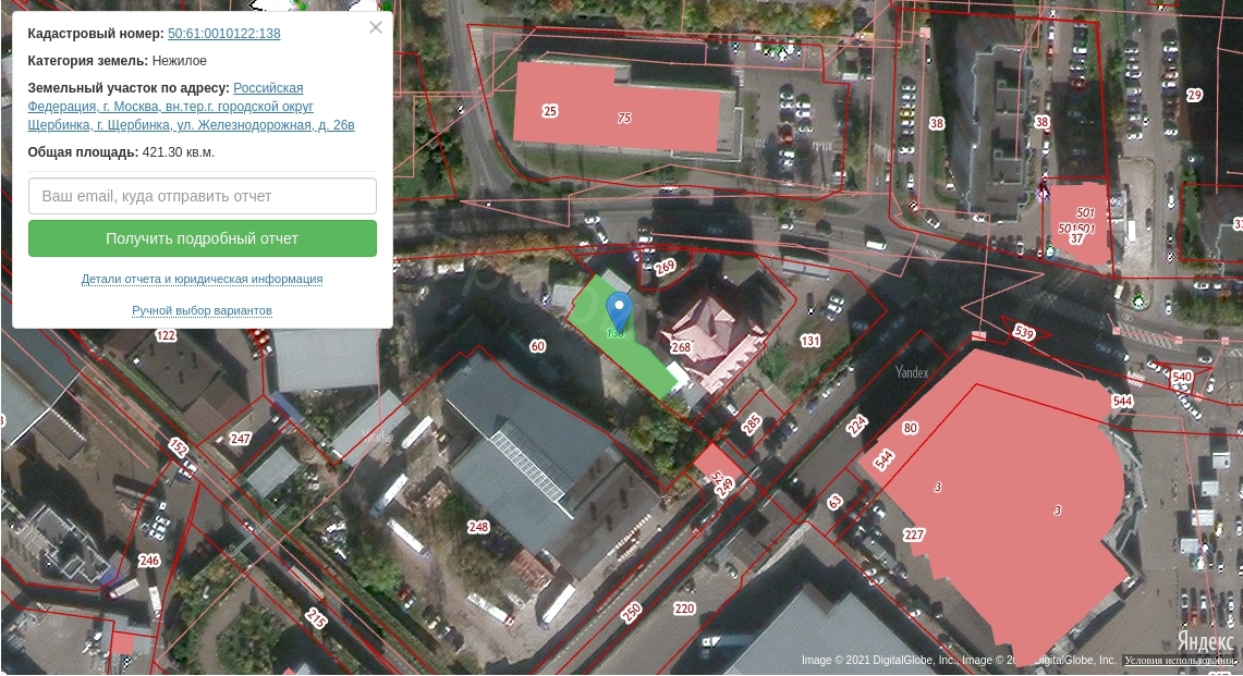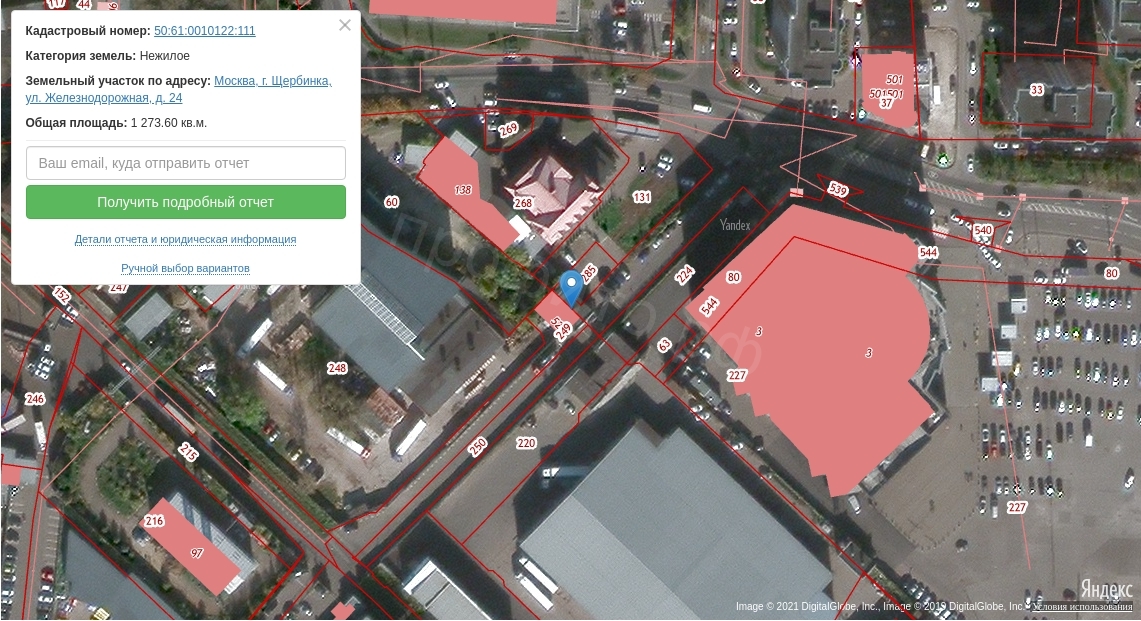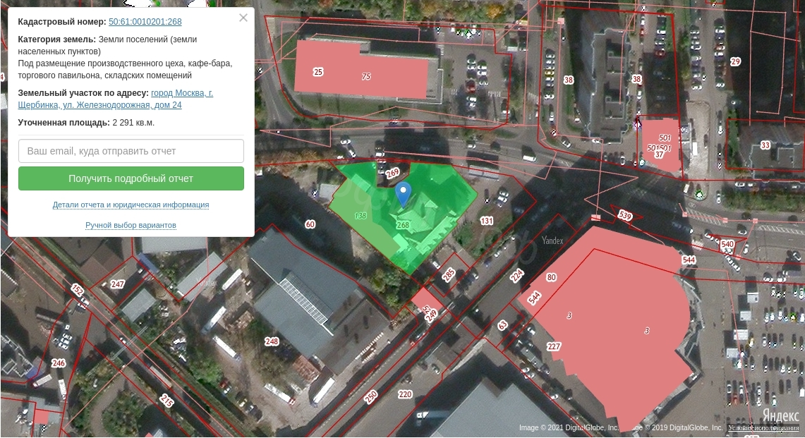 1.5 Земельный участок, общей площадью 2291 (две тысячи двести девяносто один) кв.м., кадастровый номер: 50:61:0010201:268, категория земель: земли населенных пунктов, вид разрешенного использования: под размещение производственного цеха, кафе-бара, торгового павильона, складских помещений. Адрес: г. Москва, г. Щербинка, ул. Железнодорожная, д. 24