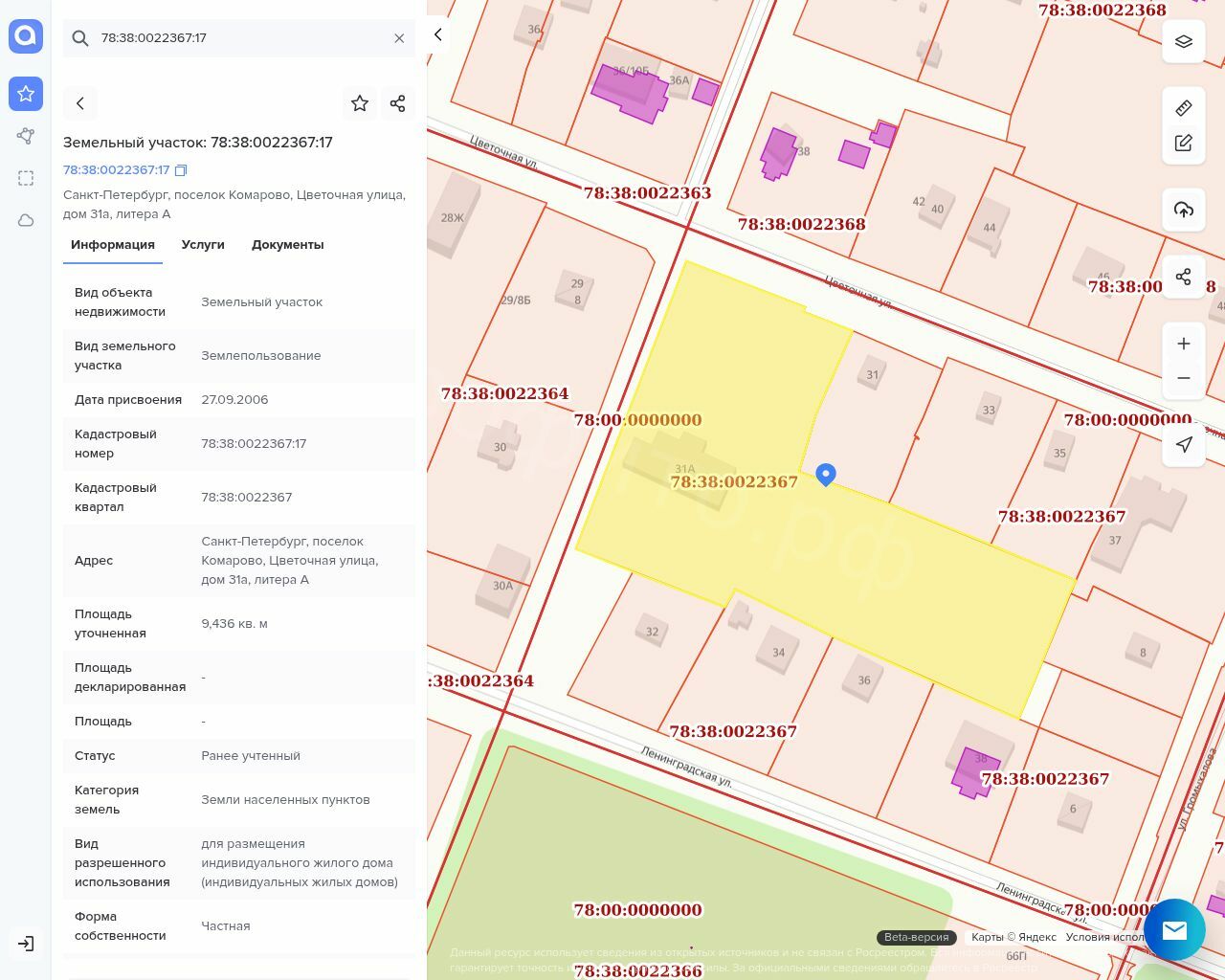 Жилой дом кадастровый номер 78:38:0022367:24, площадью 528,6 кв.м., а также земельный участок, площадью 9 436 кв.м., кадастровый номер 78:38:0022367:17
