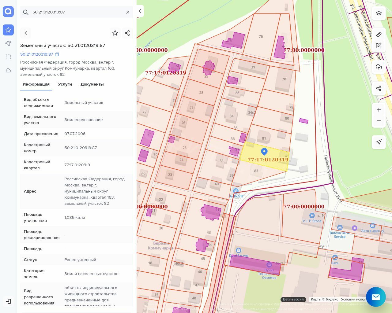 Земельный участок кадастровым номером 50:21:0120319:87, площадью 1100 кв.м., Адрес: г. Москва, п. Сосенское, п. Коммунарка, тер. СНТ Берёзка-Коммунарка-1, уч. Владение 82,