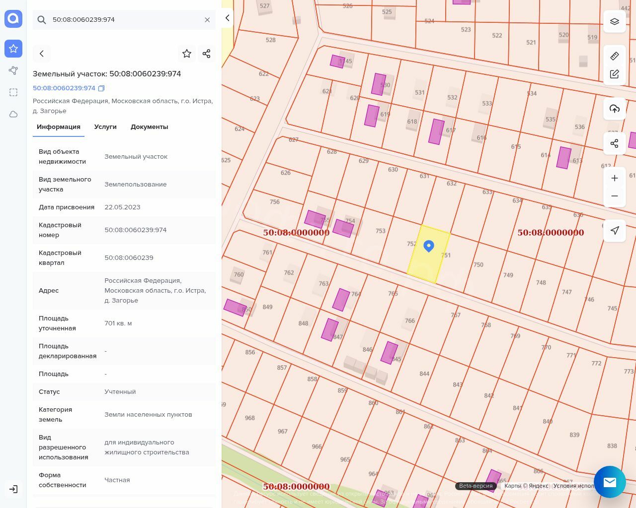 Земельный участок, площадью 701 +/- 9 кв. м, категория земель: земли населенных пунктов, разрешенное использование: для индивидуального жилищного строительства, с кадастровым номером: 50:08:0060239:974.