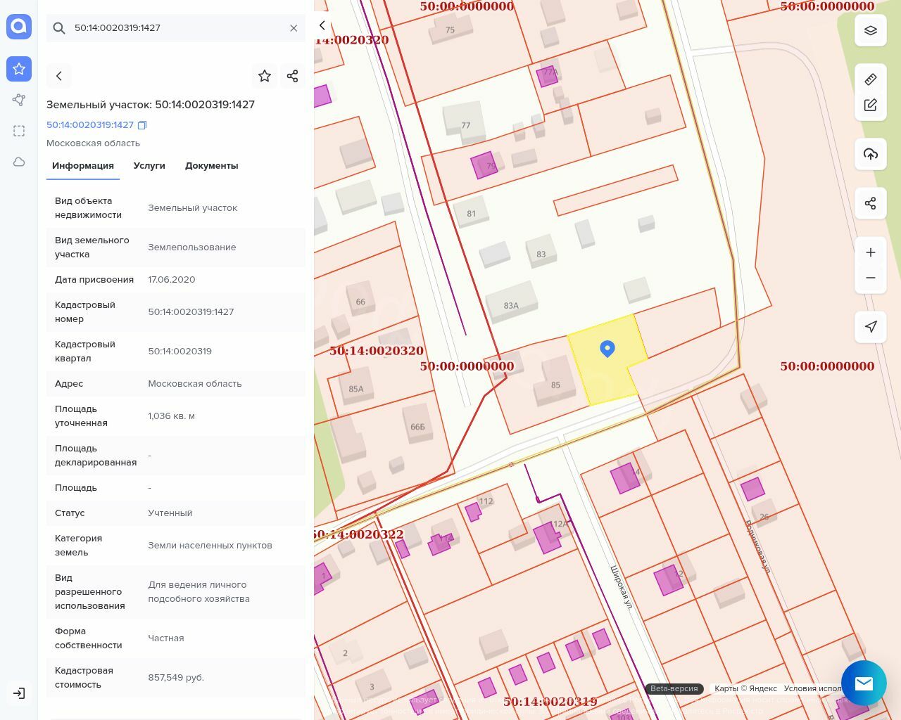 Земельный участок, кадастровый номер 50:14:0020319:1427 общей площадью 1036 +/- 11 кв.м;