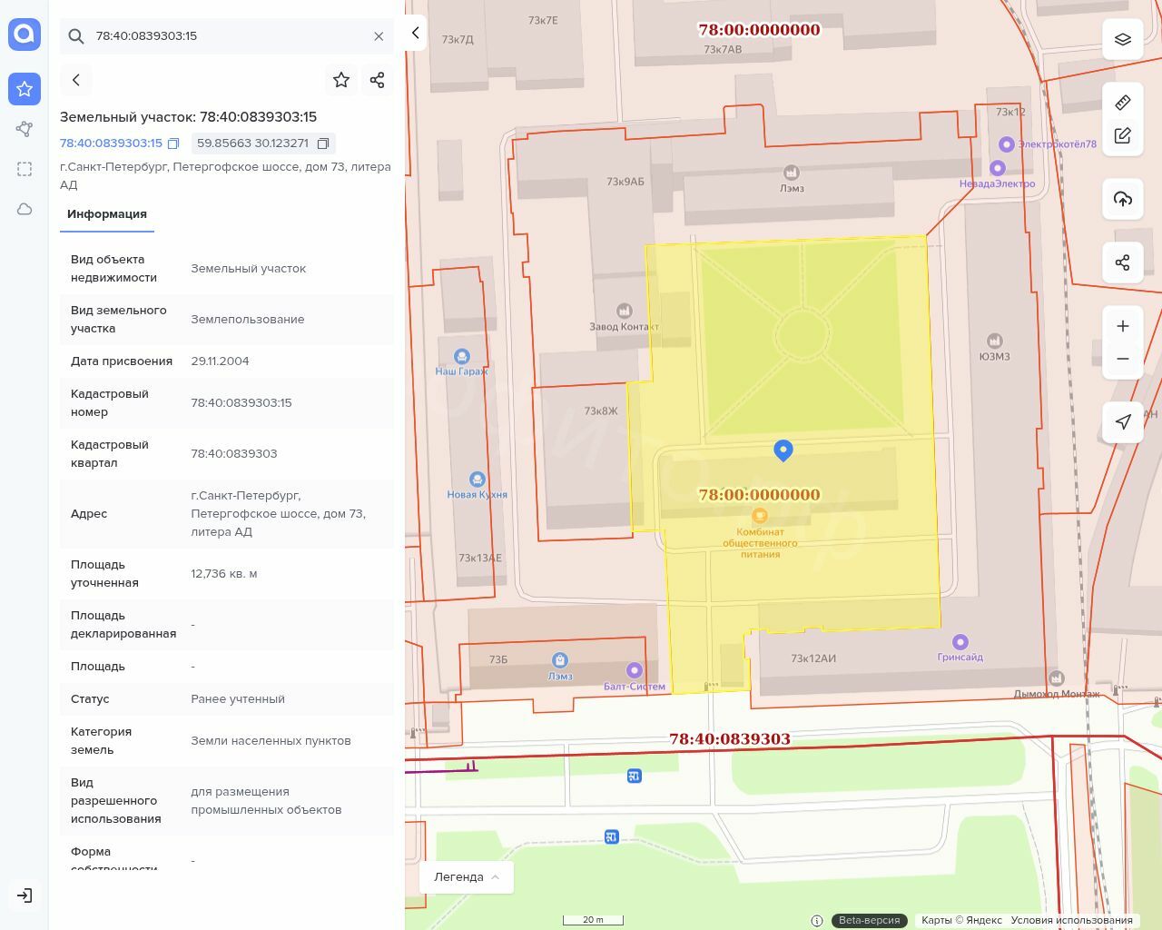 2. Земельный участок, кадастровый № 78:40:0839303:15, площадью 12736 кв. м, категория: земли населённых пунктов, вид разрешённого использования: для размещения промышленных объектов и расположенное на участке нежилое здание: Здание ЦКБ, корпус № 4, кадастровый № 78:40:0839303:2026, площадью 2034 кв. м Адрес: г. Санкт-Петербург, Петергофское ш., д. 73, лит. АД. Ограничение прав и обременение: прочие ограничения прав и обременения объекта недвижимости: № 78-01-289/2004-575.2 от 10.12.2004 (публичное); № 78-01-289/2004-575.3 от 10.12.2004 (публичное); № 78-78-01/0509/2007-636 от 15.10.2007 в пользу ООО «Лайн» (ИНН 7801310529), договор № 01/С об установлении сервитута от 08.05.2007; ипотека: № 78:40:0839303:15-78/011/2023-7 от 06.12.2023; № 78:40:0839303:15-78/011/2023-8 от 06.12.2023; № 78:40:0839303:15-78/011/2023-9 от 06.12.2023; № 78:40:0839303:2026-78/011/2023-5 от 06.12.2023; № 78:40:0839303:2026-78/011/2023-6 от 06.12.2023; № 78:40:0839303:2026-78/011/2023-7 от 06.12.2023.