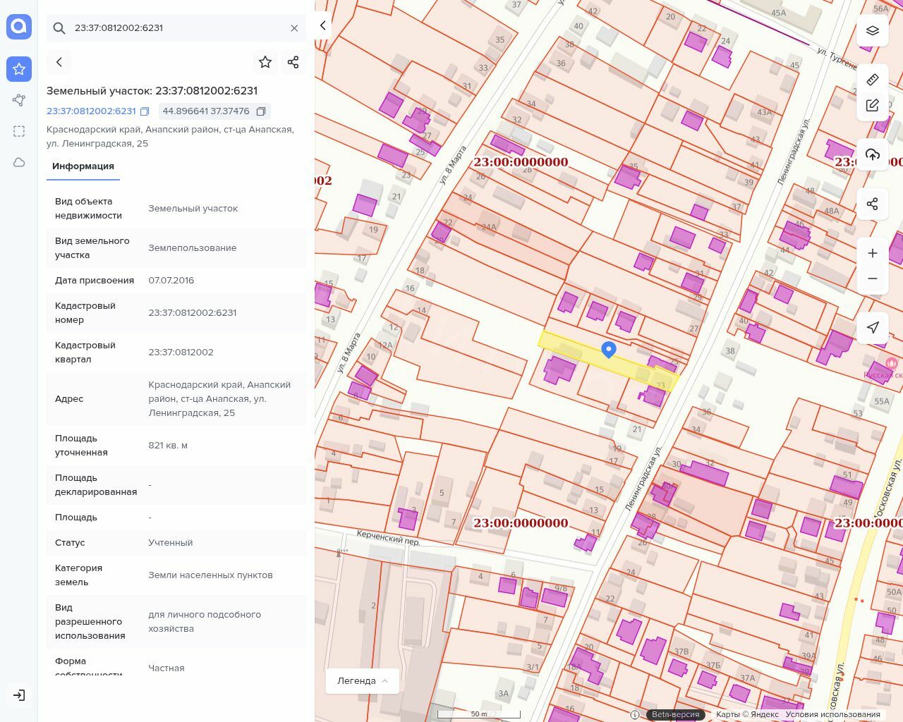 Земельный участок, площадь 821 +/- 6.69 кв.м., кадастровый (условный) номер: 23:37:0812002:6231. Виды разрешенного использования объекта недвижимости: для личного подсобного хозяйства.